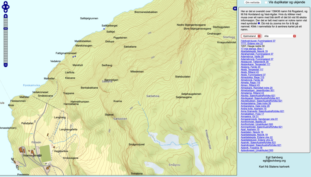 Sommaren 2022 overtok Mitt Hjelmeland stadnamnprosjektet i Hjelmeland. Me inngjekk samtidig eit samarbeid med Egil Sølvberg om å registrera og kartfesta lokale stadnamn frå Hjelmeland på lokalnamn.no.